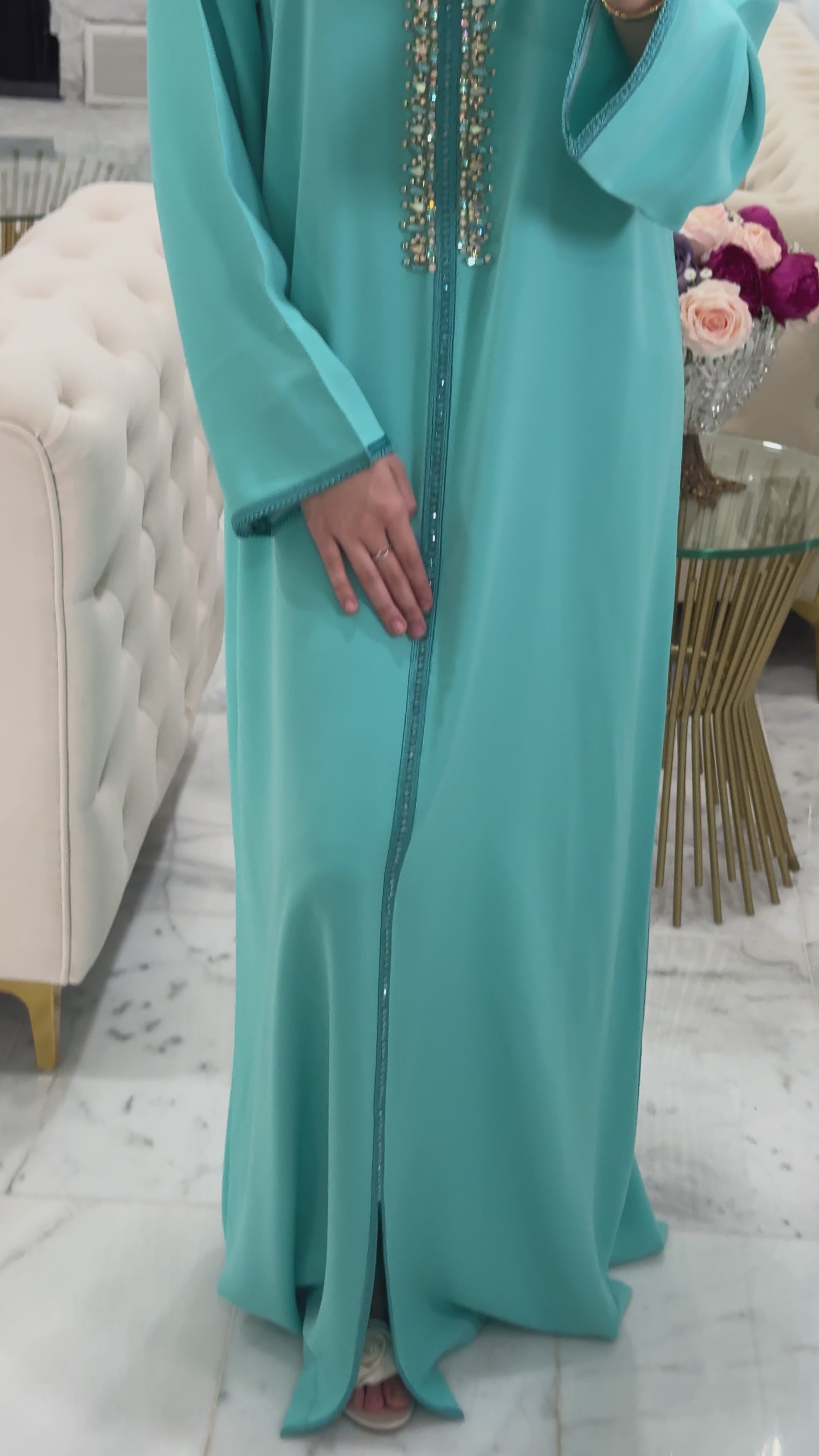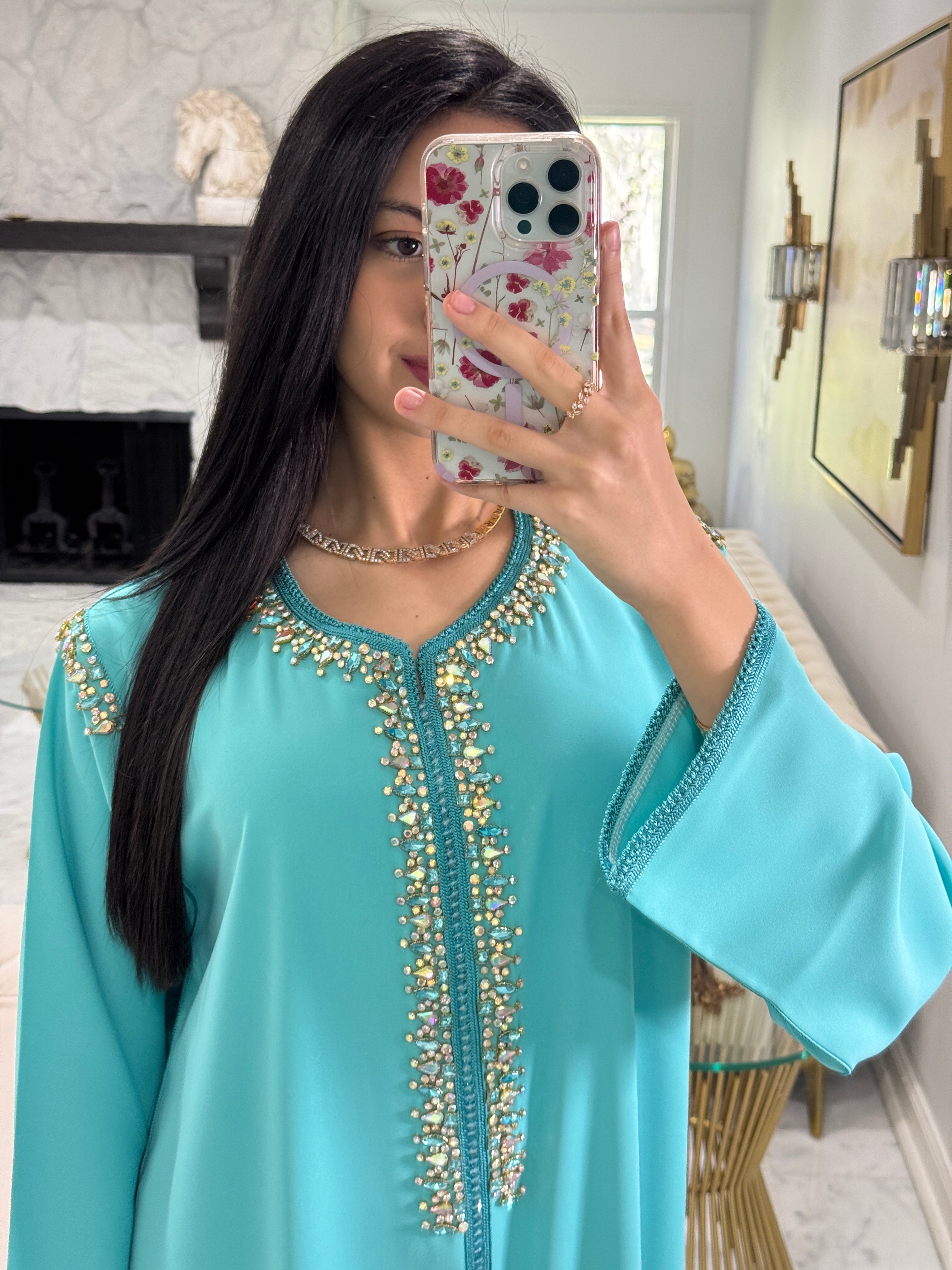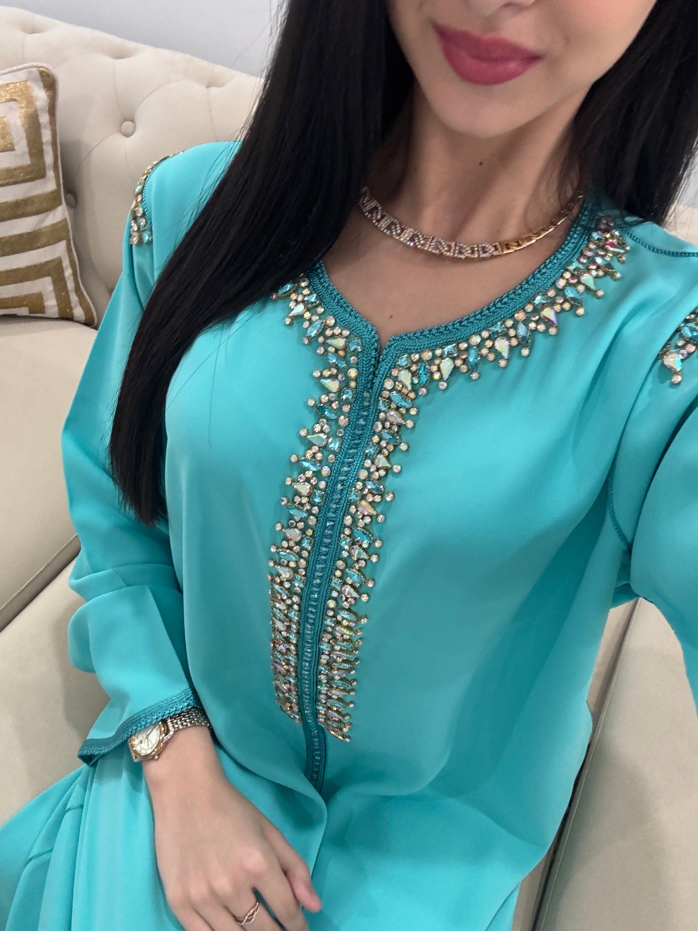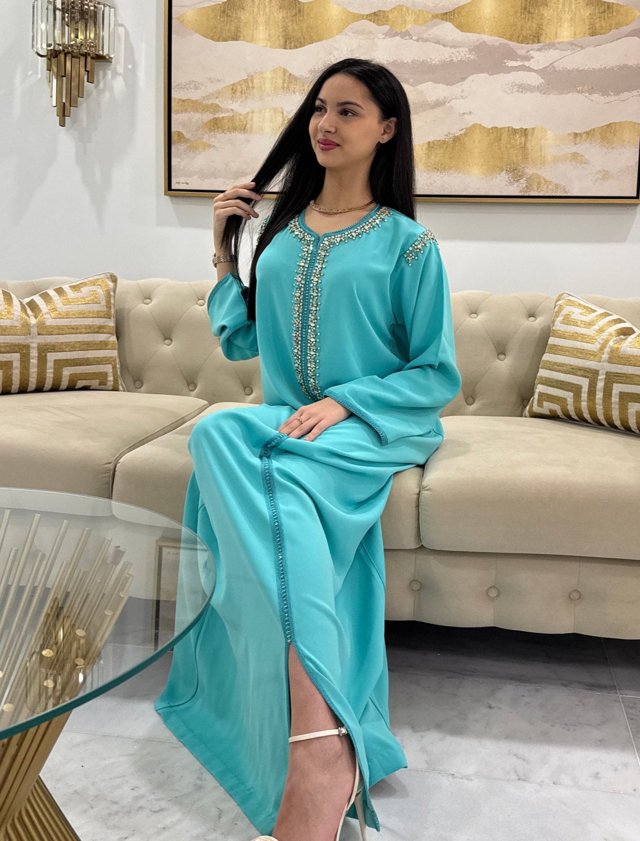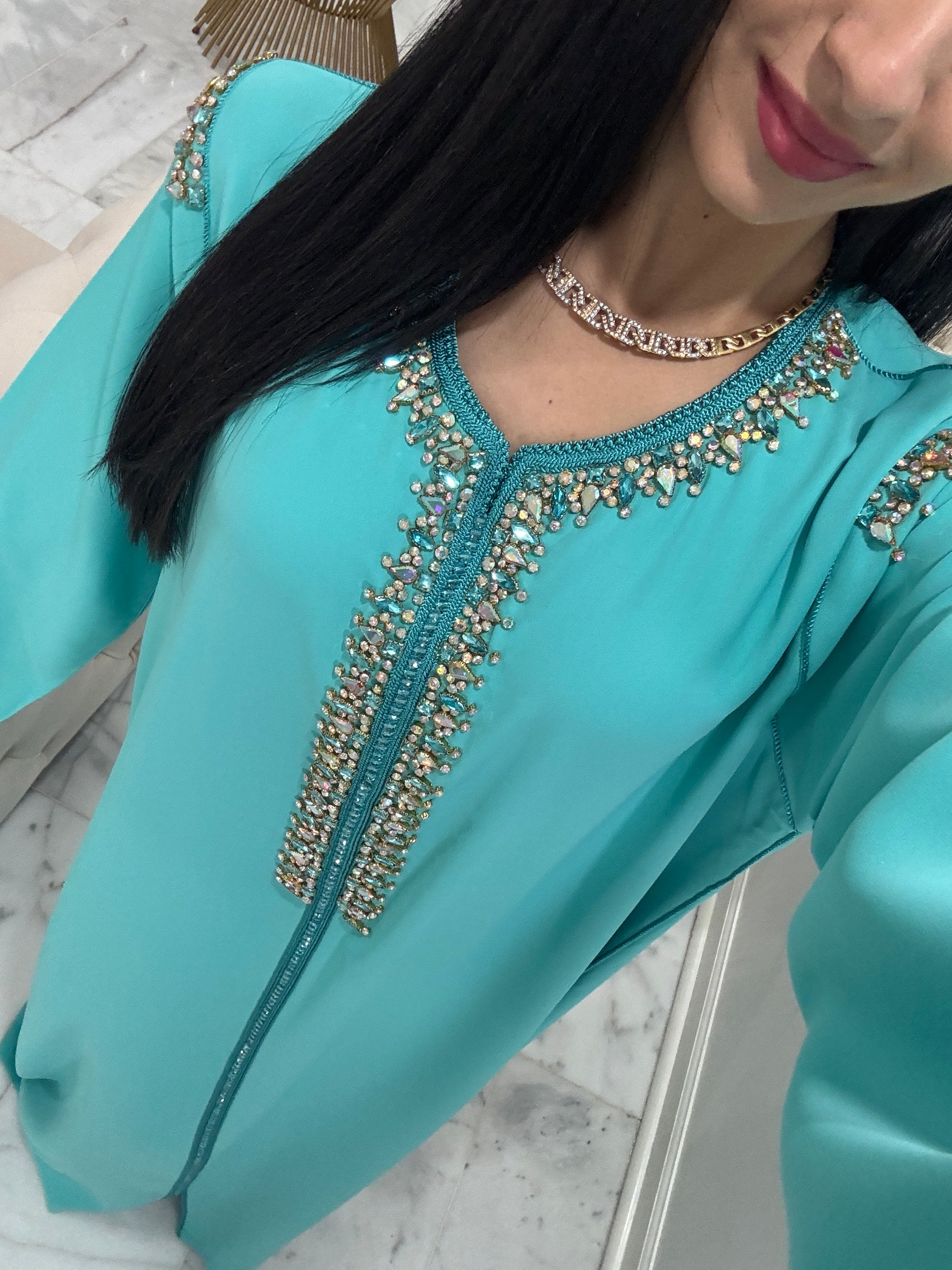Draped in a soothing teal hue, the Alara Kmiss embodies effortless sophistication. Delicate embroidery graces the center and shoulders, adding a subtle yet striking touch of Moroccan artistry. Its flowing silhouette and refined details make it the perfect choice for welcoming guests or elevating your at home Ramadan attire with understated elegance.