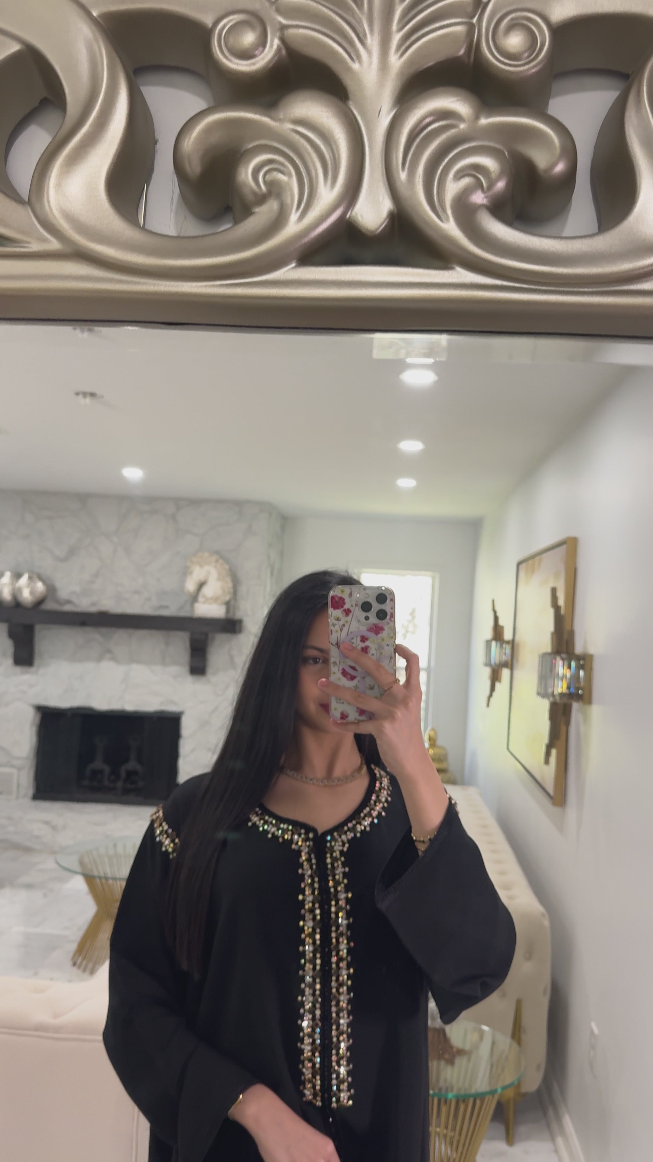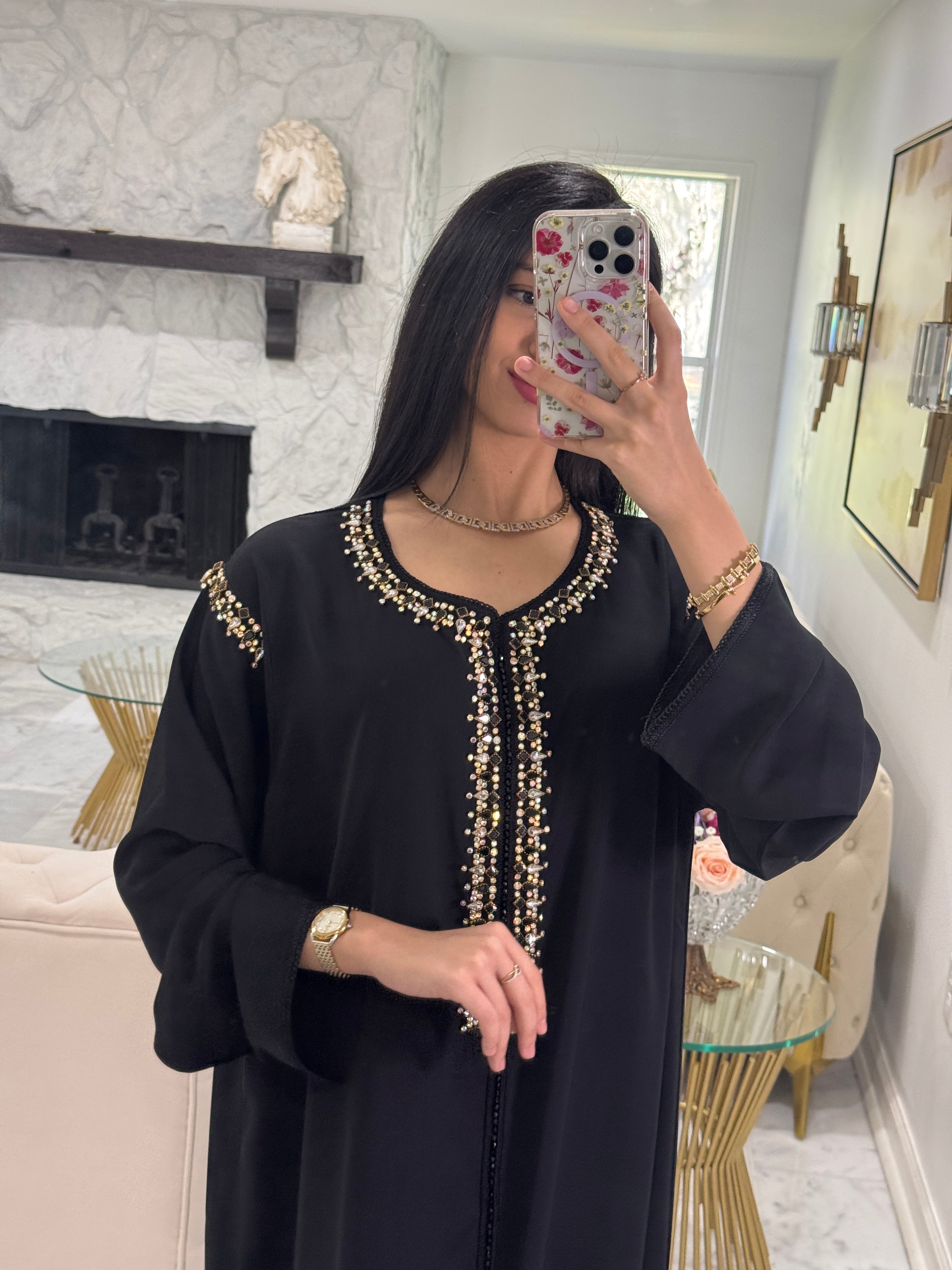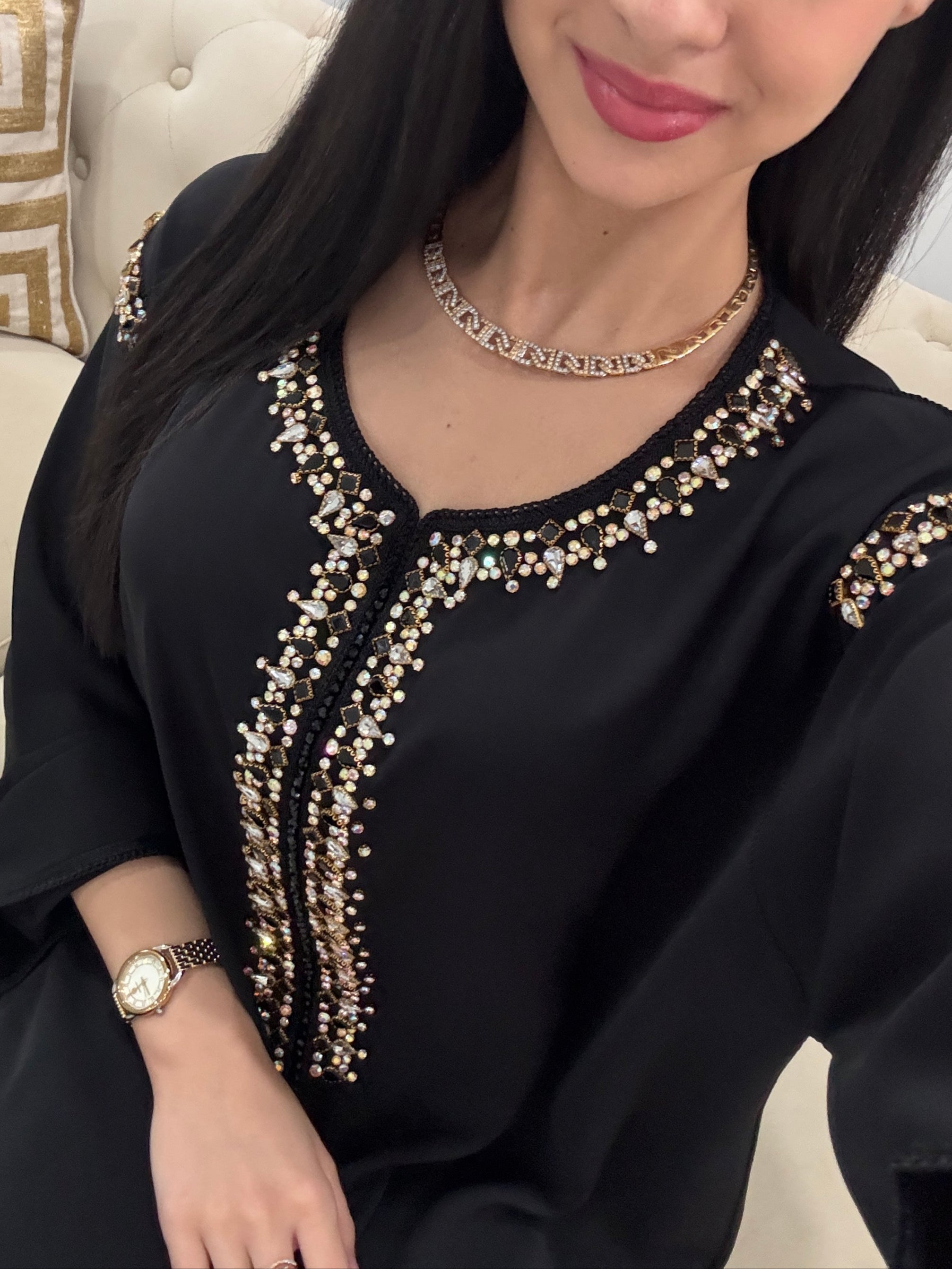 Refined and effortlessly chic, the Diana Kmiss is a celebration of understated luxury. The classic black fabric serves as the perfect canvas for its delicate embellishments, which adorn the center and shoulders with subtle brilliance. A staple for any elegant gathering, Diana is the embodiment of grace, making it an essential for Ramadan evenings or intimate celebrations at home.