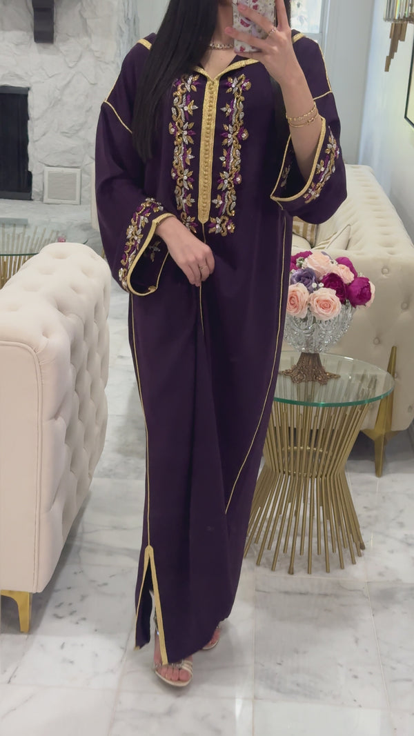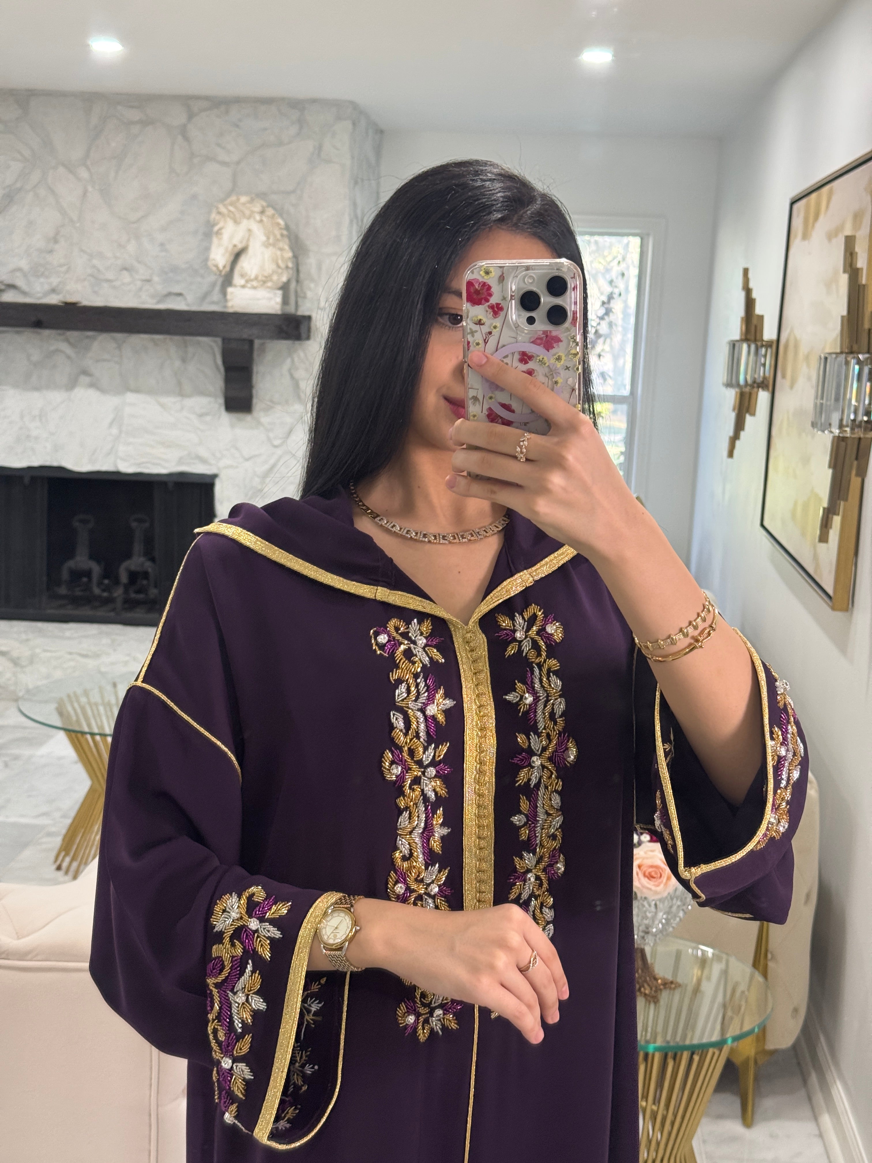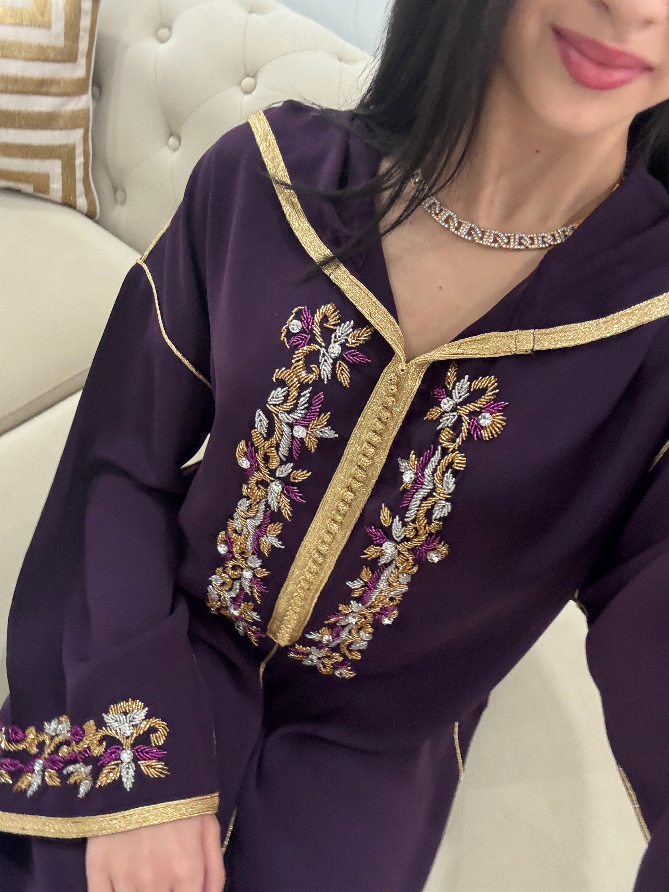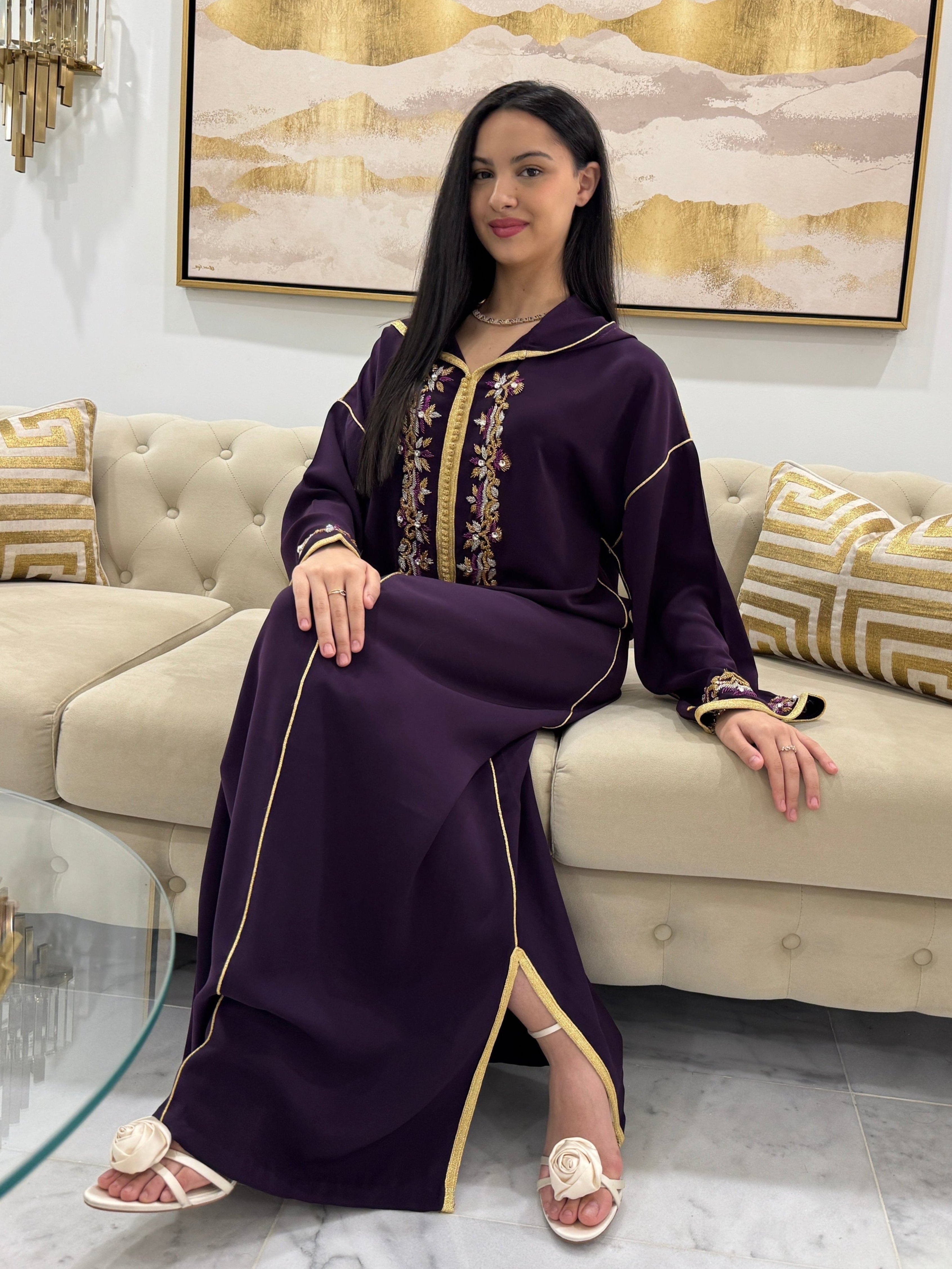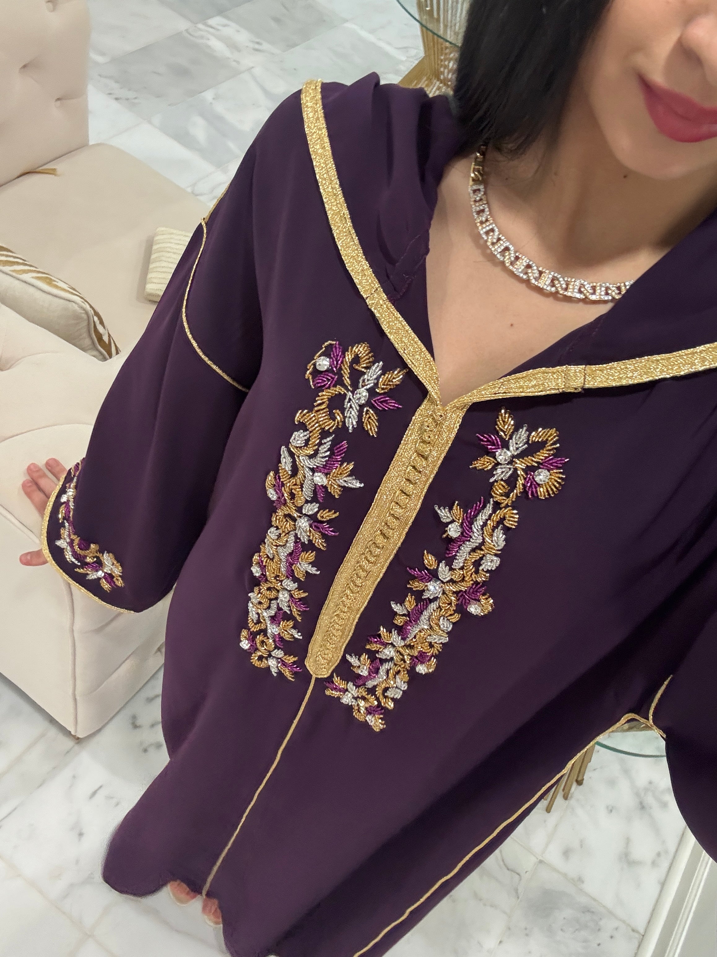 A symbol of strength and femininity, the Imane Jellaba is bathed in a rich, royal purple hue, exuding an aura of timeless elegance. Gold, purple, and silver embroidery hand-sewn along the neckline, forming a delicate tapestry of blooming florals. The hooded design, edged with golden accents, adds a refined touch, making this piece as enchanting as it is versatile. Imane is for the woman who carries tradition with modern elegance.