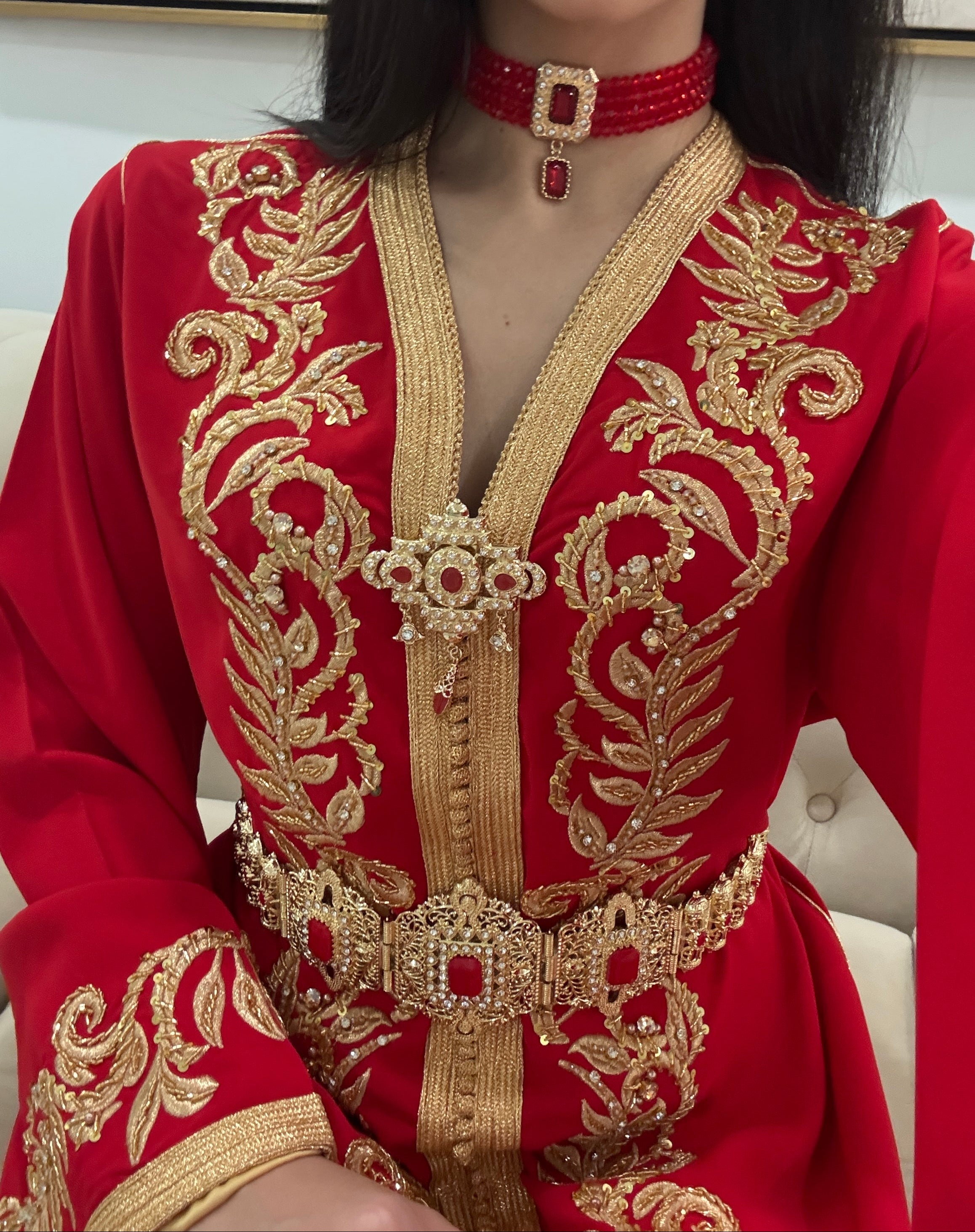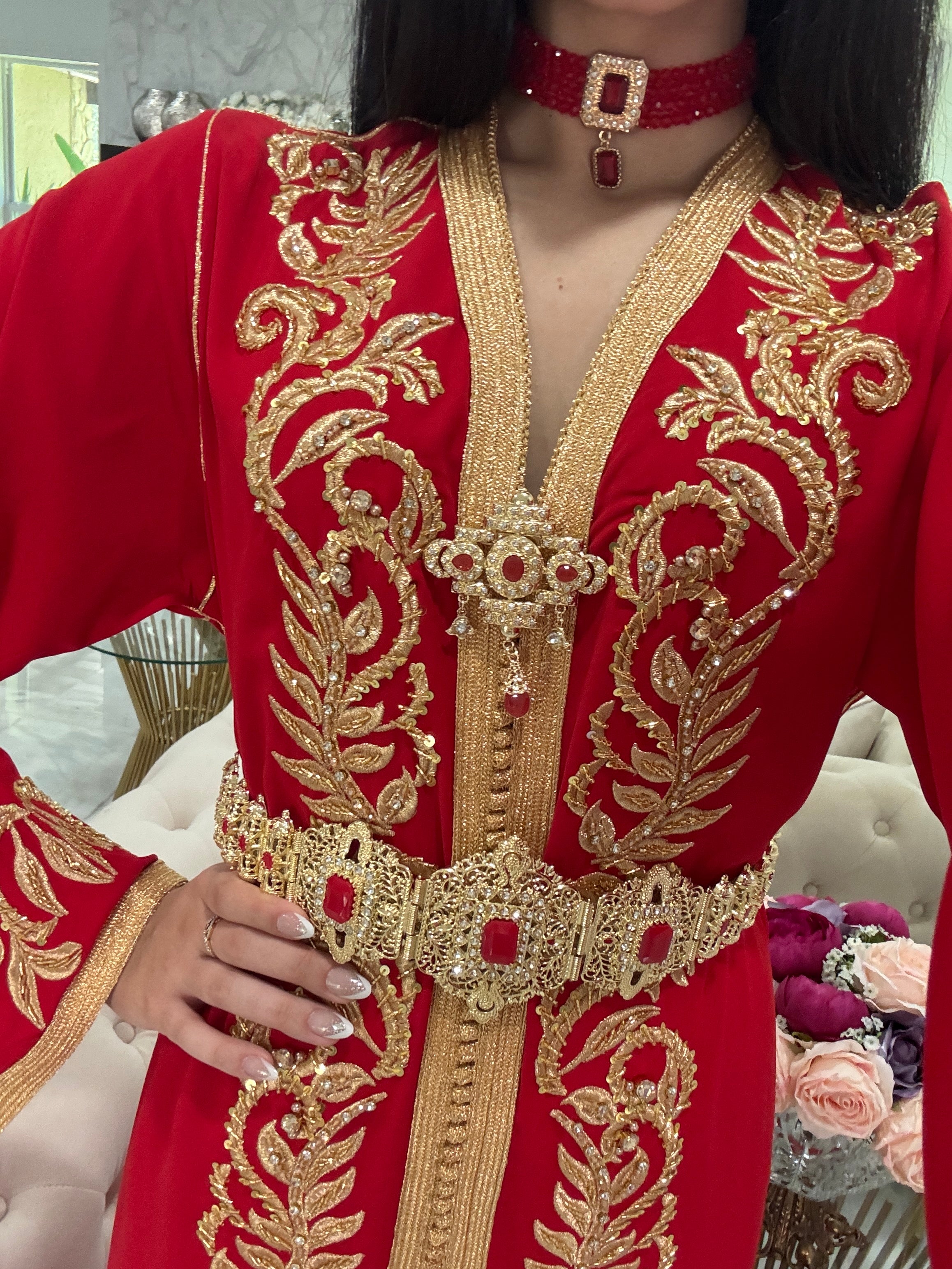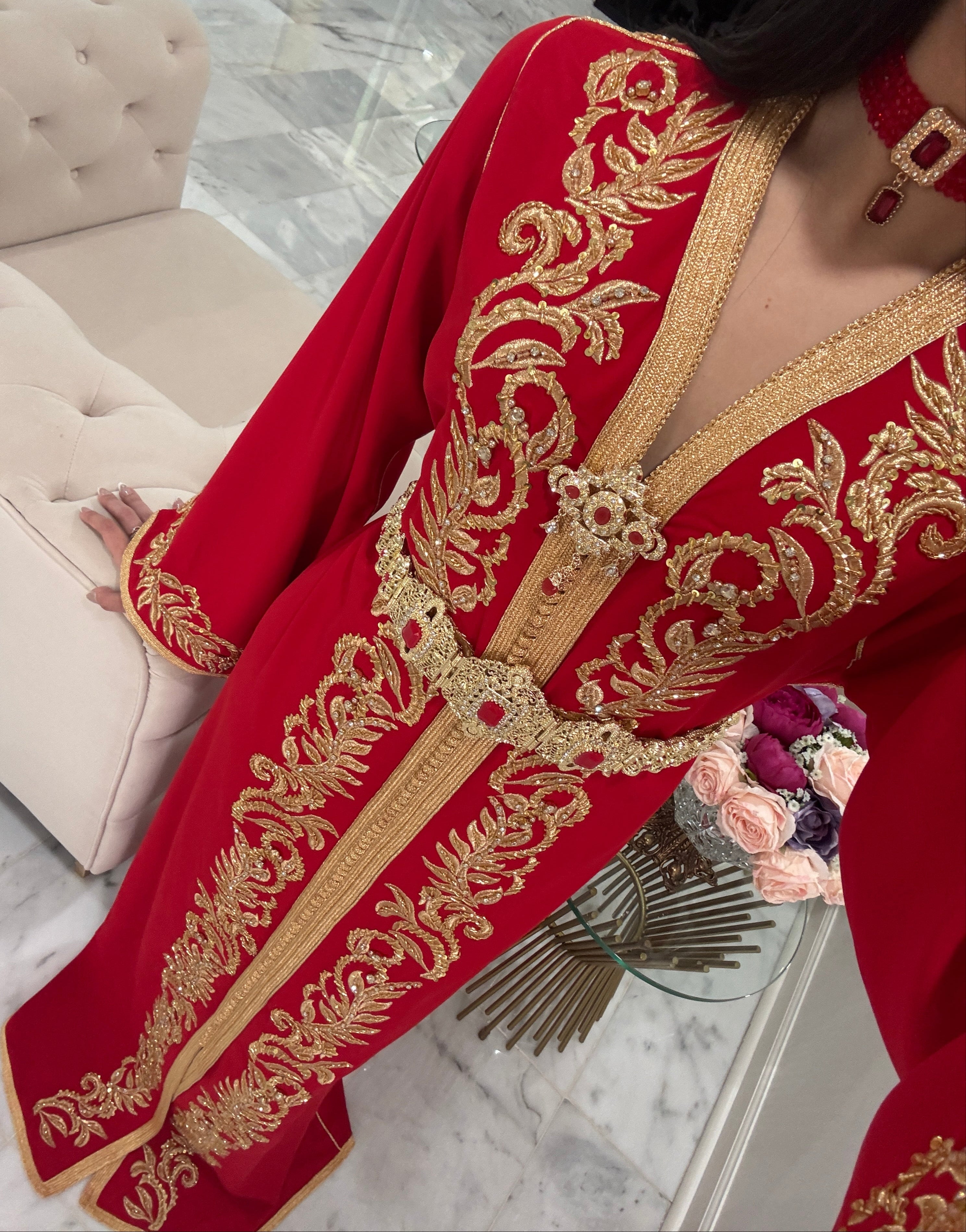 Introducing the Salma Caftan, our first piece in a bold new red. We chose this with purpose. In Moroccan culture, red symbolizes strength, love, and celebration, making it the perfect color to welcome the summer season. The caftan features detailed golden embroidery along the bodice and cuffs, all carefully handcrafted. The silhouette is modest and flowing, with a high neckline and soft embellishments that adds elegance.